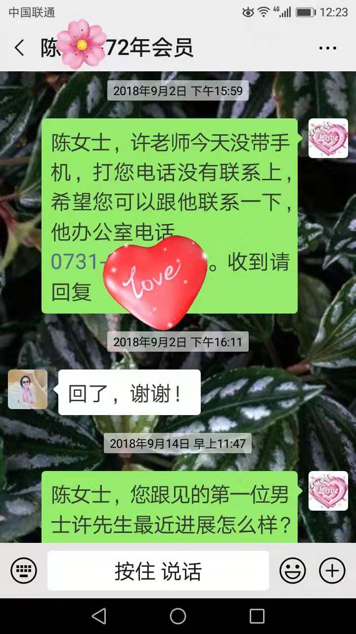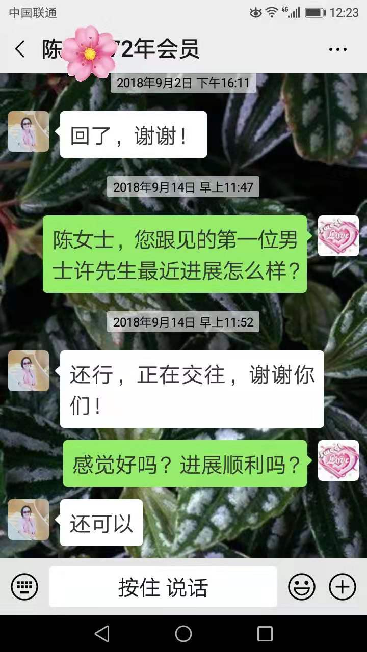 入會的當(dāng)天,非常有意思的就約到一位大學(xué)教授許老師見面。這也是我們專業(yè)老師為她推薦的。許老師對她的感覺也不錯。這就是她第三次入會的第一次介紹??瓷先ゲ懖惑@,感覺上是順風(fēng)順?biāo)?,果不其然,在回訪中她很快就告訴我們她和老師在交往中了!更可愛的是62年的許老師,有一次跟陳女士約會,離見面還有三個多小時發(fā)現(xiàn)自己忘記帶手機(jī)了,著急得不行的,跟我們打電話,說怕陳女士找不到他著急,托我們告訴女士他辦公室的電話,說他一會還要開個會,開完會就給她打電話。這份緊張勁,不是十幾歲的少男少女們才有的嗎?我們的老師隔著電話線都感覺到了,趕緊把這個情況跟陳女士溝通了,當(dāng)然把許老師的緊張也笑著傳遞給了陳女士。