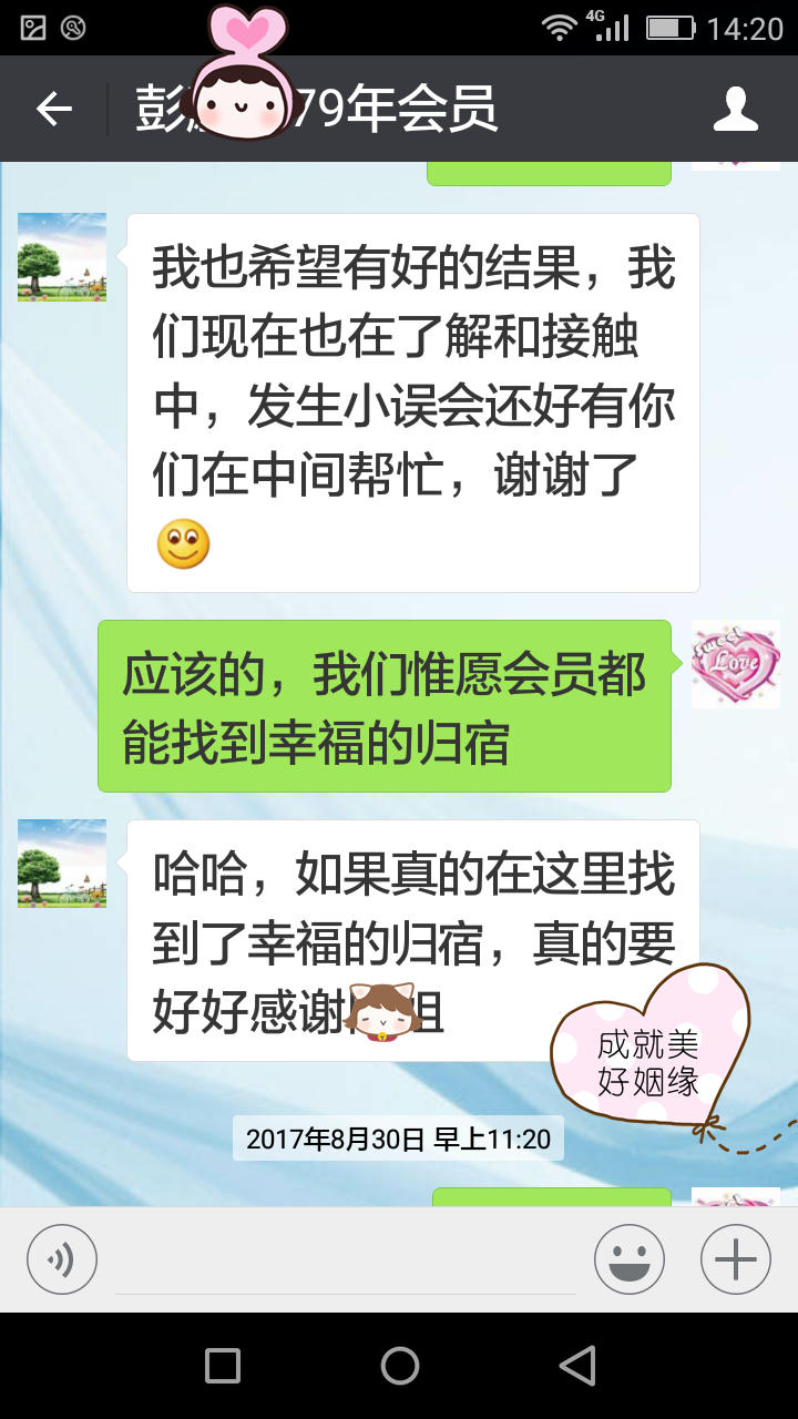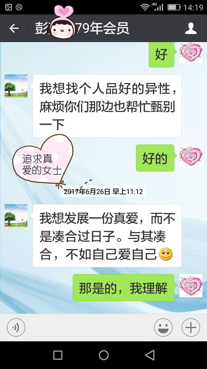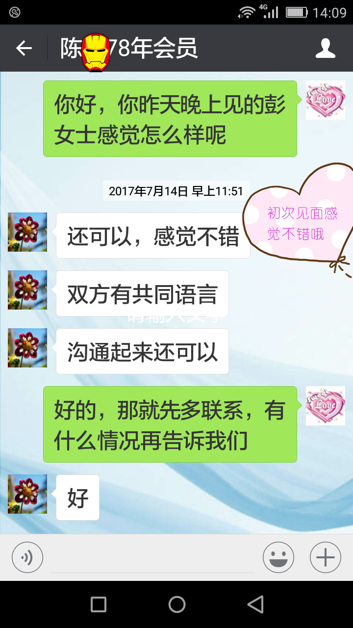 偶然機會我聽見一個朋友說她在我們婚介找了對象,這樣我才了解到,婦聯(lián)下面還有一個二級機構(gòu),公辦的婚介,每個會員都需要簽訂服務(wù)協(xié)議,對會員的權(quán)益有保障。于是,我鼓足勇氣,來到了位于長沙市芙蓉區(qū)白沙路10號的科達名居-------長沙婦聯(lián)婚姻介紹服務(wù)中心,當(dāng)面咨詢了解相關(guān)事宜!紅娘老師認(rèn)真接待了我,并且?guī)臀彝扑]了很多和我匹配的男士手工資料,讓我自己做出決定,是否同意見面。我感覺資料都挺真實可靠的。高學(xué)歷、機關(guān)單位、穩(wěn)定實在的男士也挺多的。但是當(dāng)時我對愛情失去了信心,雖然在資料里看見很多條件優(yōu)秀的男士,還是沒有把握是否能找到,所以就申請了一個時間比較長點的會員。