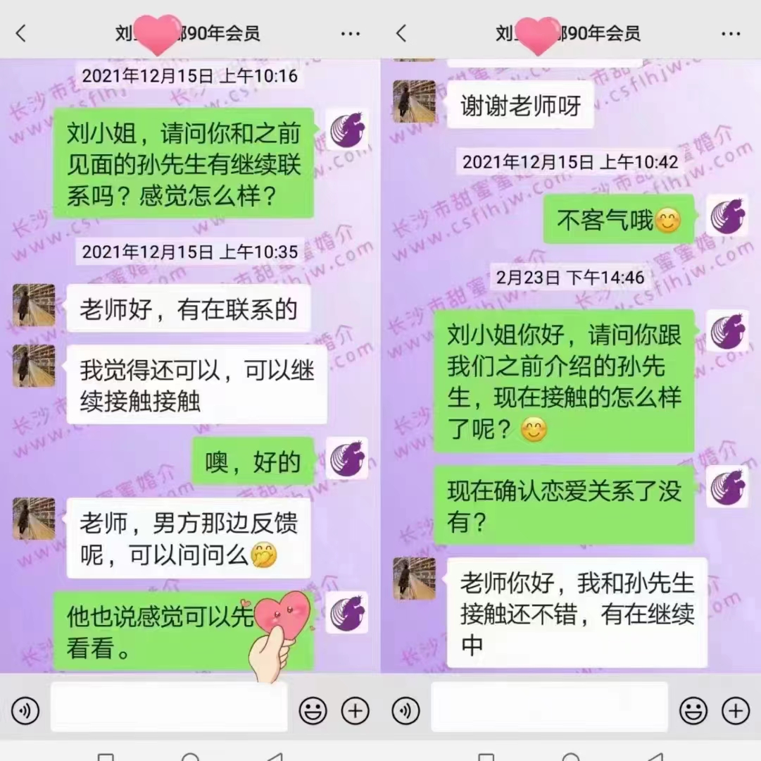 孫先生是一位碩士畢業(yè)的部隊軍官,他性格溫和、愛好運動。因親戚在長沙,想今后轉(zhuǎn)業(yè)來長沙發(fā)展,經(jīng)過多方了解,知道我們公司是一家講誠信、口碑高的婚戀平臺,于是很順利的注冊成為我們長沙甜蜜蜜婚戀公司的會員。在他入會后的第二天,由我們高級婚戀專家安排了劉小姐和孫先生見面。于是,兩個對的人在對的時間和地點開啟了他們的緣分之旅。