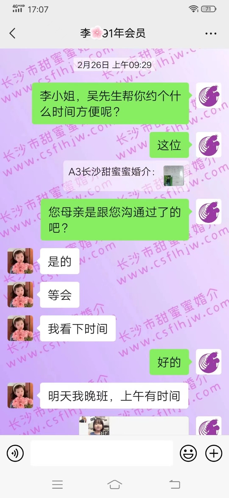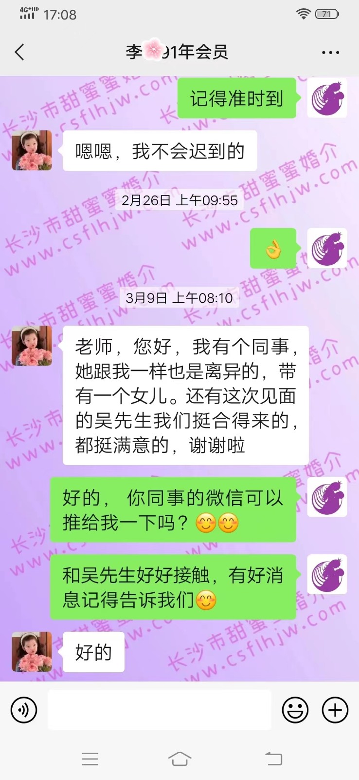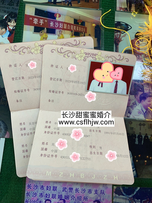李女士是一位省級醫(yī)院在編的主管護師,因兩地分居和前夫友好分開,在母親的陪同下,來到長沙甜蜜蜜婚介公司。今年3月2日,在專業(yè)紅娘老師的精心安排下,約見了一位愛好運動、性格溫和、國企在編的先生與其見面,雙方一見鐘情,感覺非常合拍!雙方于2023年5月19日,領(lǐng)取了結(jié)婚證。
